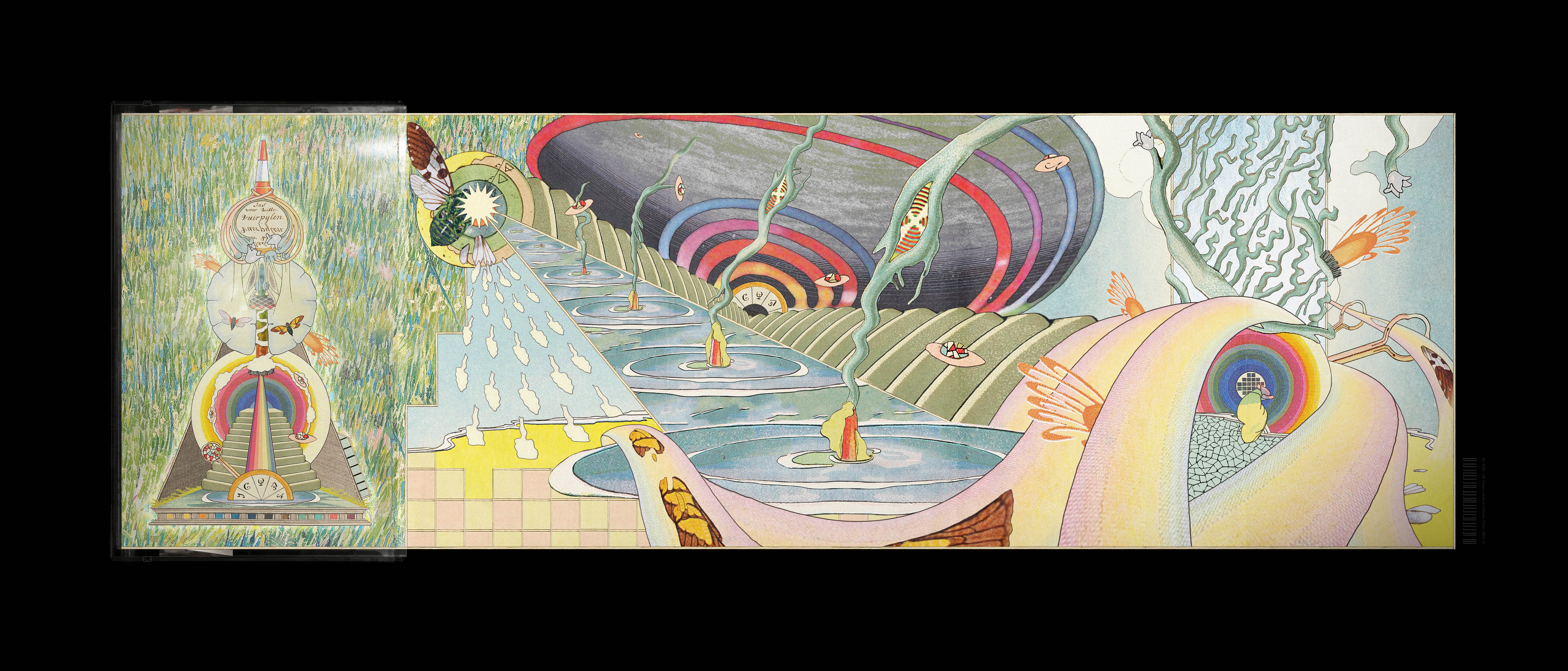 The album art design for the Takazawa album, "Niji Sanpo" cassette kit. I created a psychedelic world about the rainbow, and extended the cover art to make a richer world view to present the inner page design, just like the abundant world inside the album.